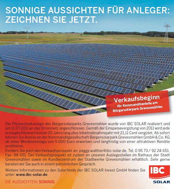 Die IBC Solar GmbH bietet die Beteiligungsmöglichkeit am Bürgersolarpark Grevesmühlen an. Profitieren Sie von den wirtschaftlichen Möglichkeiten der solaren Energiegewinnung und zeichnen Sie Anteile an unserer Bürgersolarpark Grevesmühlen GmbH & Co. KG. Die Photovoltaik-Freiland-Anlage am Standort Grevesmühlen, im Landkreis Nordwestmecklenburg, mit einer Leistung von 1.646,80 kWp speist bereits seit Juli 2011 umweltfreundlichen Solarstrom ins öffentliche Netz ein. Die prognostizierte Rendite beträgt ohne Berücksichtigung individueller steuerlicher Effekte 6,05 % vor Gewerbesteuer. Der prognostizierte Kapitalrückfluss beträgt 271,92 % vor Gewerbesteuer auf das eingesetzte Eigenkapital. Ab einer Mindesteinlage von 5.000 EUR ist eine Beteiligung an diesem Bürgersolarkraftwerk möglich. Fordern Sie jetzt den Verkaufsprospekt an: peggy.walther@ibc-solar.de, Tel. 0 95 73 / 92 24-651,Fax -98 651. Der Verkaufsprospekt ist zudem an unseren Auslegestellen im Rathaus der Stadt Grevesmühlen sowie im Kundenzentrum der Stadtwerke Grevesmühlen erhältlich. Sehr gerne beraten wir Sie auch in einem persönlichen Gespräch.