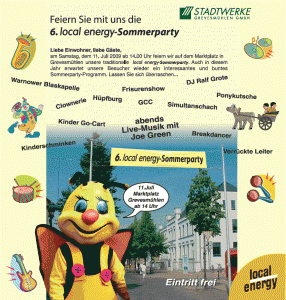 Am 11. Juli 2009 veranstalten die Grevesmühlener Stadtwerke auf dem Marktplatz die local-energy Sommerparty.